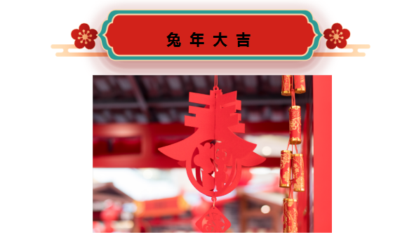 一祝大家乘風破浪,前兔無量 二祝大家光耀前路,大展宏兔 三祝大家征兔再起,前程似錦 四祝大家揚眉兔氣,兔飛猛進 2023年福兔臨門、兔步青云